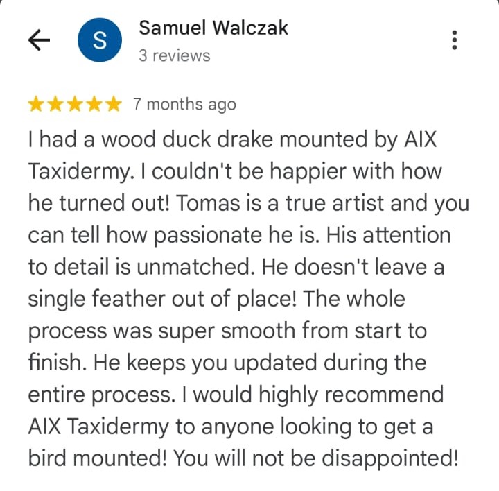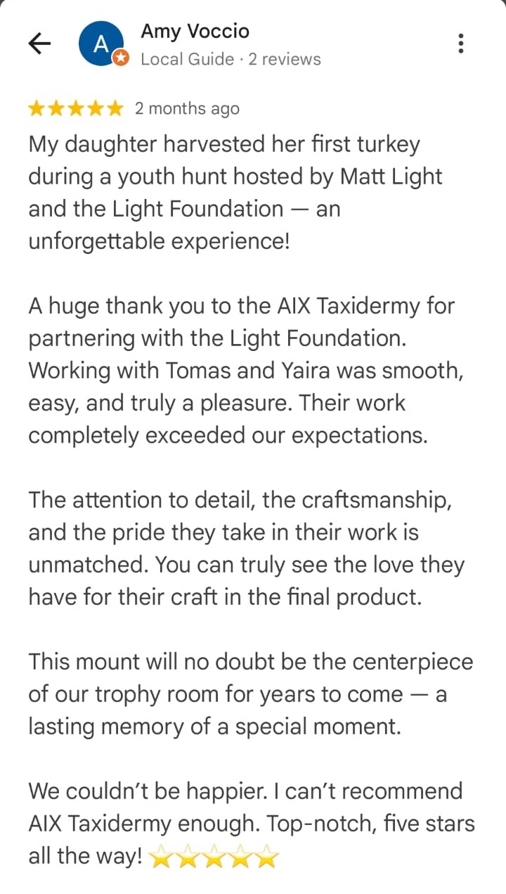 At Aix Taxidermy, we don’t just mount birds; we make sure every piece tells the story of your hunt: the shot, the skill, the conquest of the wild, the passion, and a memory worth preserving. Our commitment is to create mounts so lifelike and refined you’ll be proud to display them for generations.